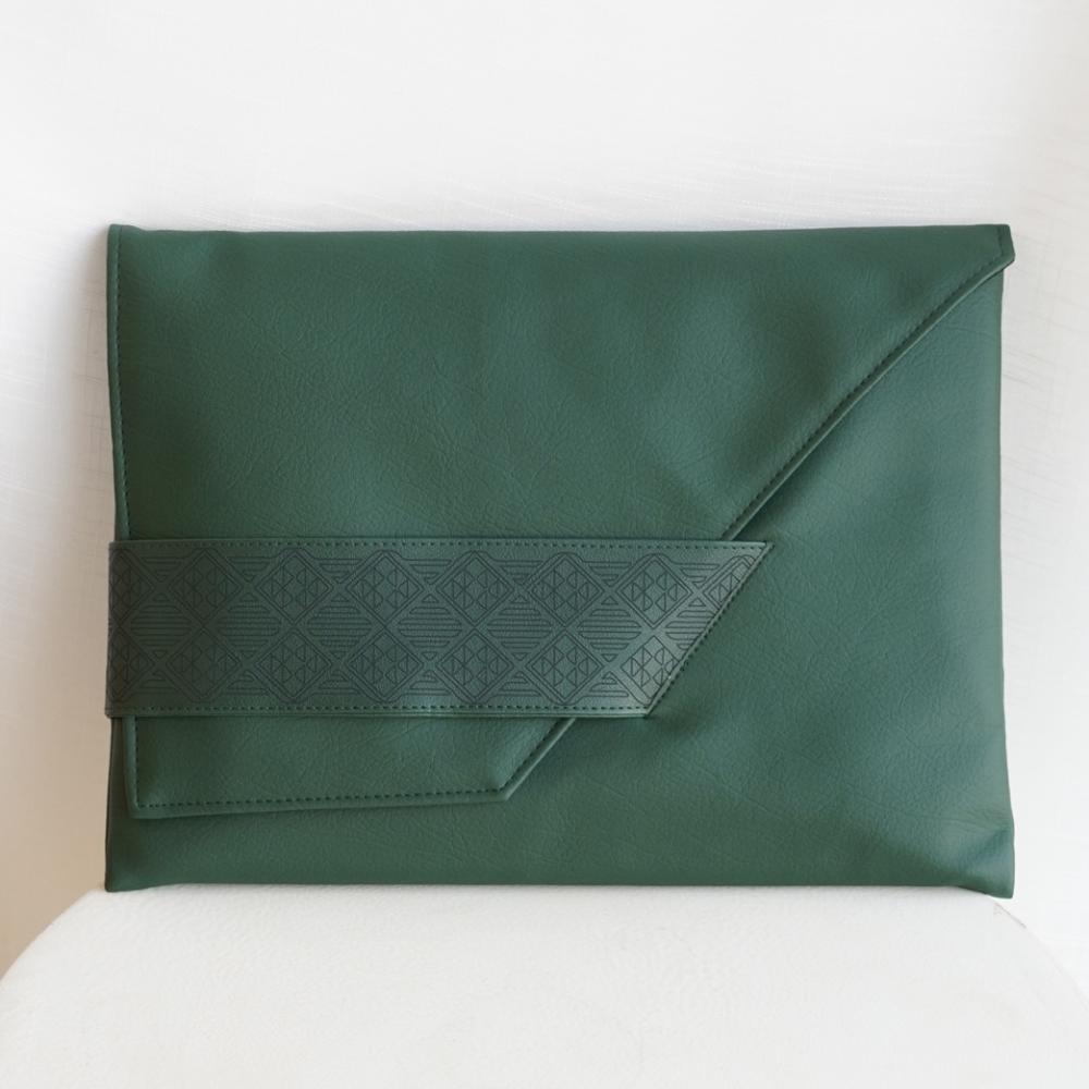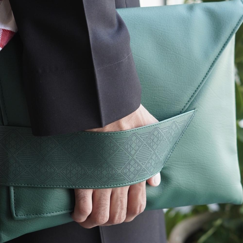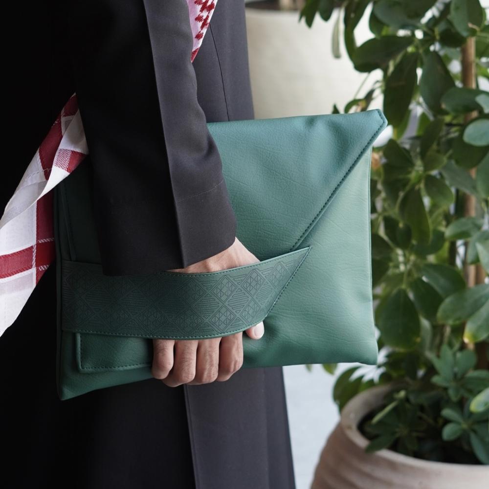 باوتش أنيقة مصنوعة من جلد صناعي عالي الجودة، بتصميم يجمع بين العملية والفخامة. نقش الليزر المستوحى من هوية اليوم الوطني السعوديعزنا بأصالتنا على المسكة يضيف لمسة أصالة خاصة.